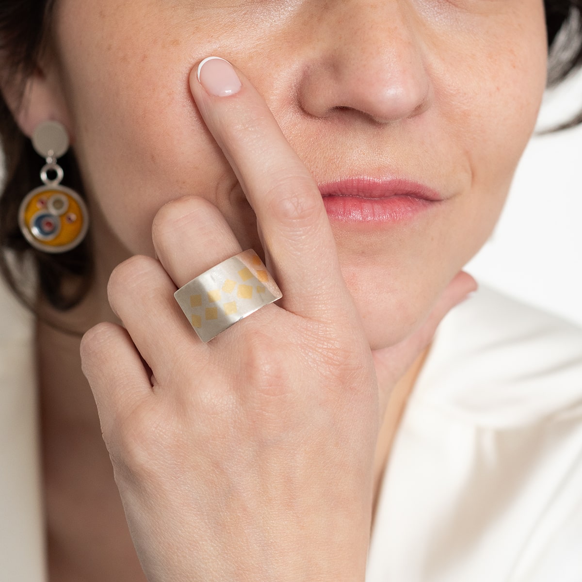 Anillo con diseño contemporáneo elaborado en Plata 950, con la técnica «Kumboo», que consiste en aplicar finas láminas de oro en su superficie.