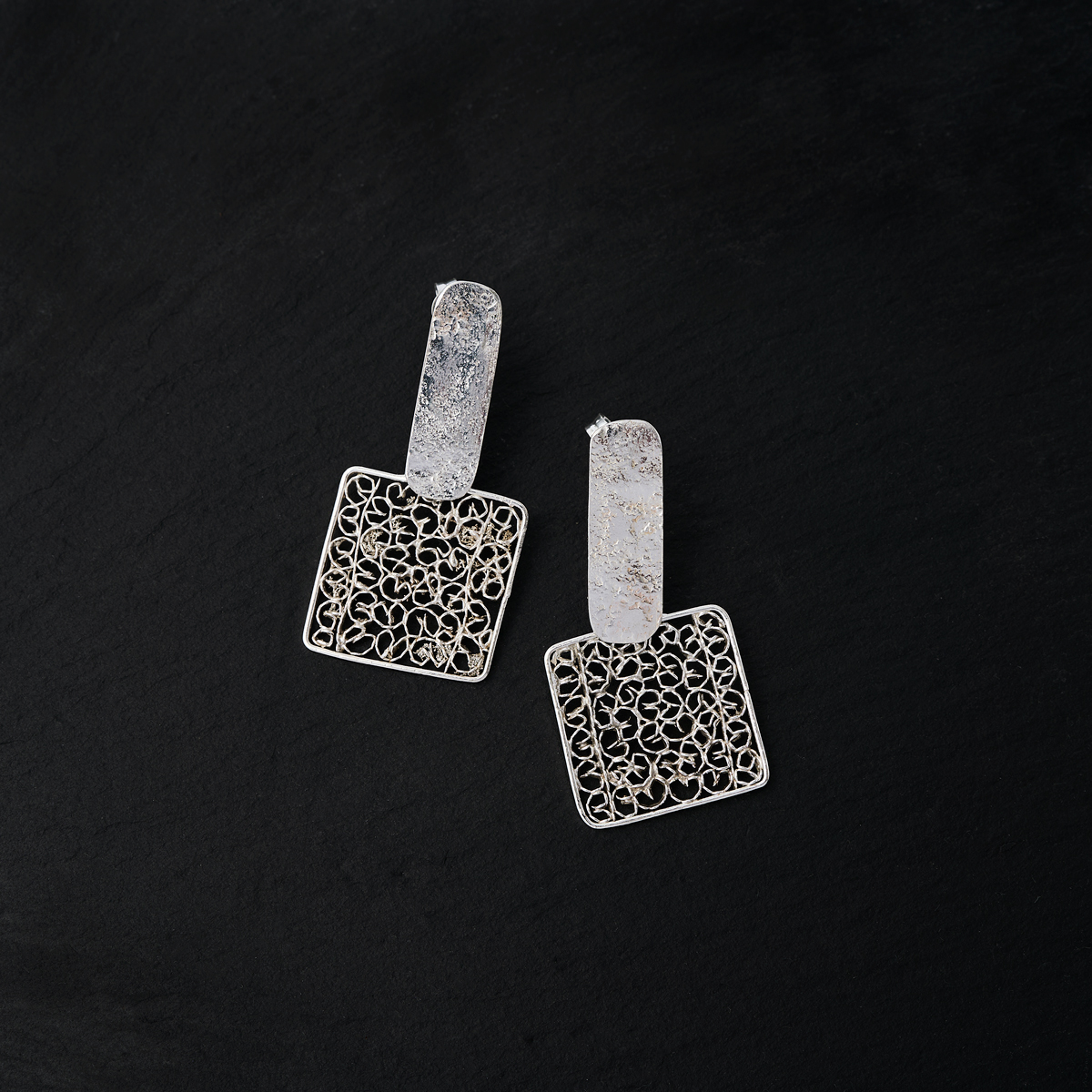 Aros compuestos por una lámina en plata 950 con la técnica del «reticulado», que produce una textura rugosa, y un cuadrado elaborado en filigrana, delicada y exclusiva técnica que sugiere un delicado y fino encaje. Te aportarán elegancia y realce en una ocasión especial.