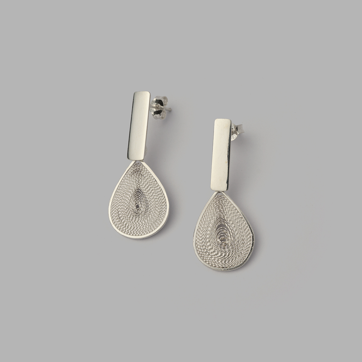 Lámina de plata 950, y gotita en filigrana. Largo: 3,5 cm.