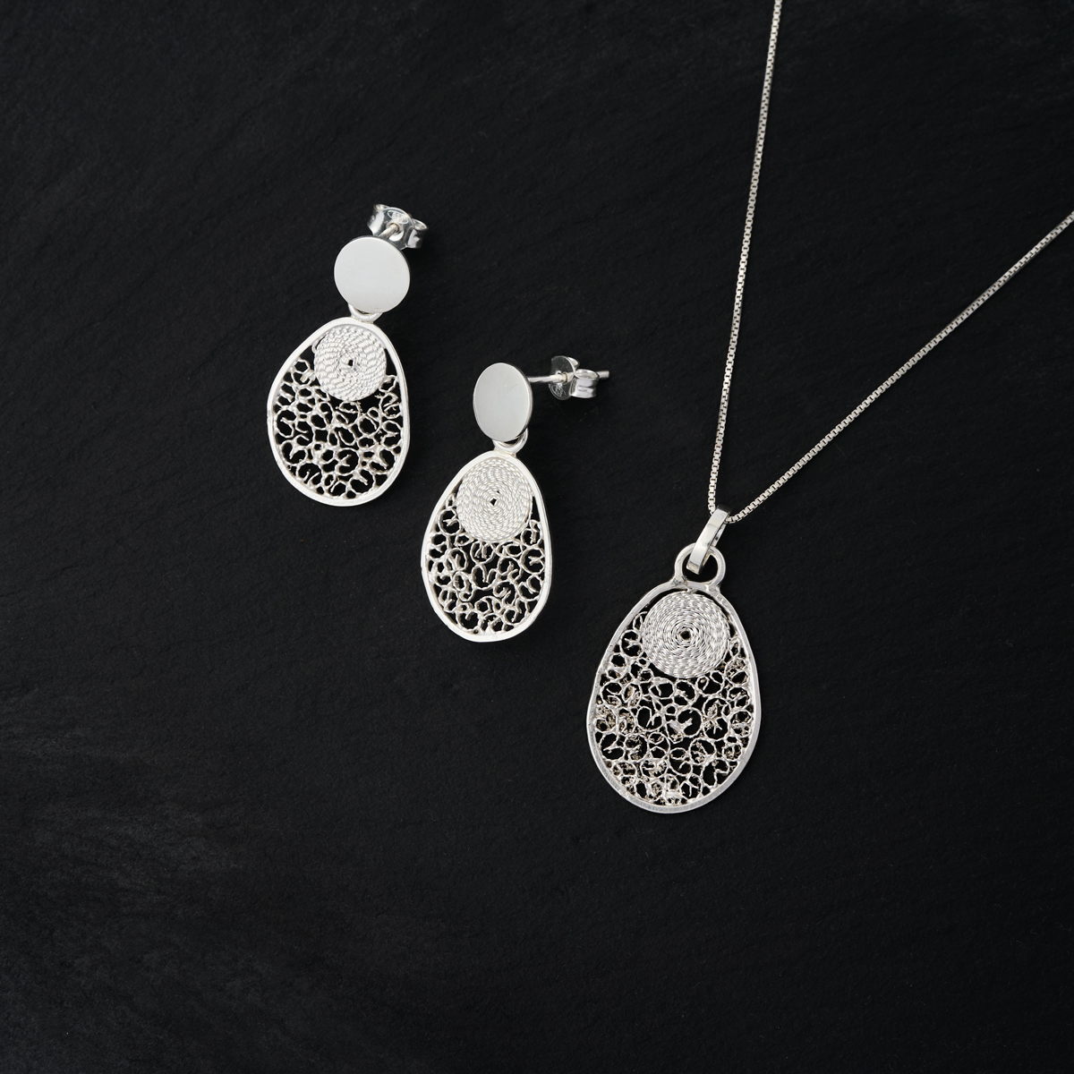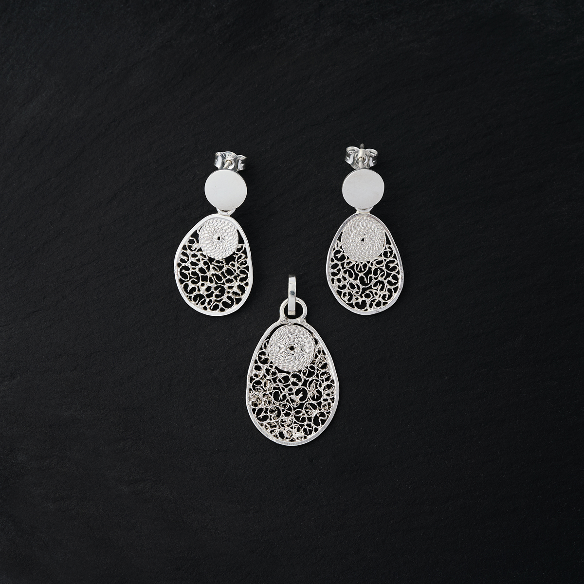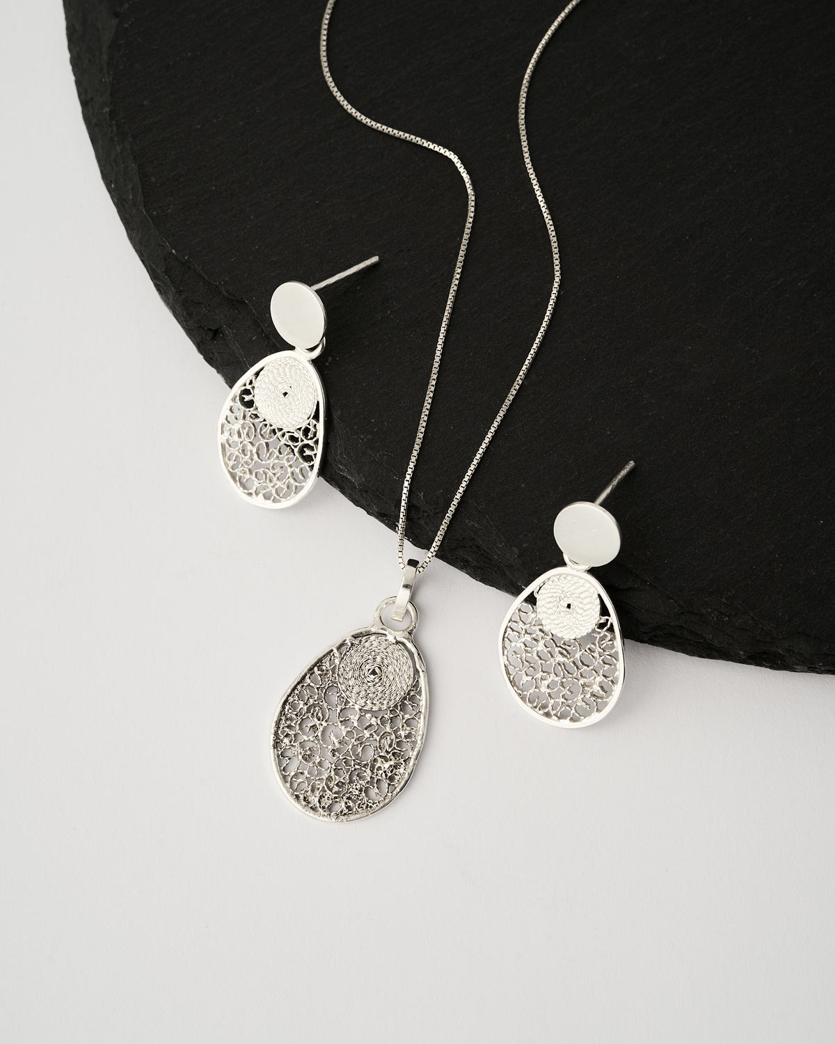Este conjunto compuesto de aros y colgante, sugieren un delicado y fino encaje, y serán perfectos para una ocasión especial. Son elaborados en filigrana, delicada y exclusiva técnica que combina tejido y orfebrería en plata. Incluyen una cadena fina de plata de 45 cm.